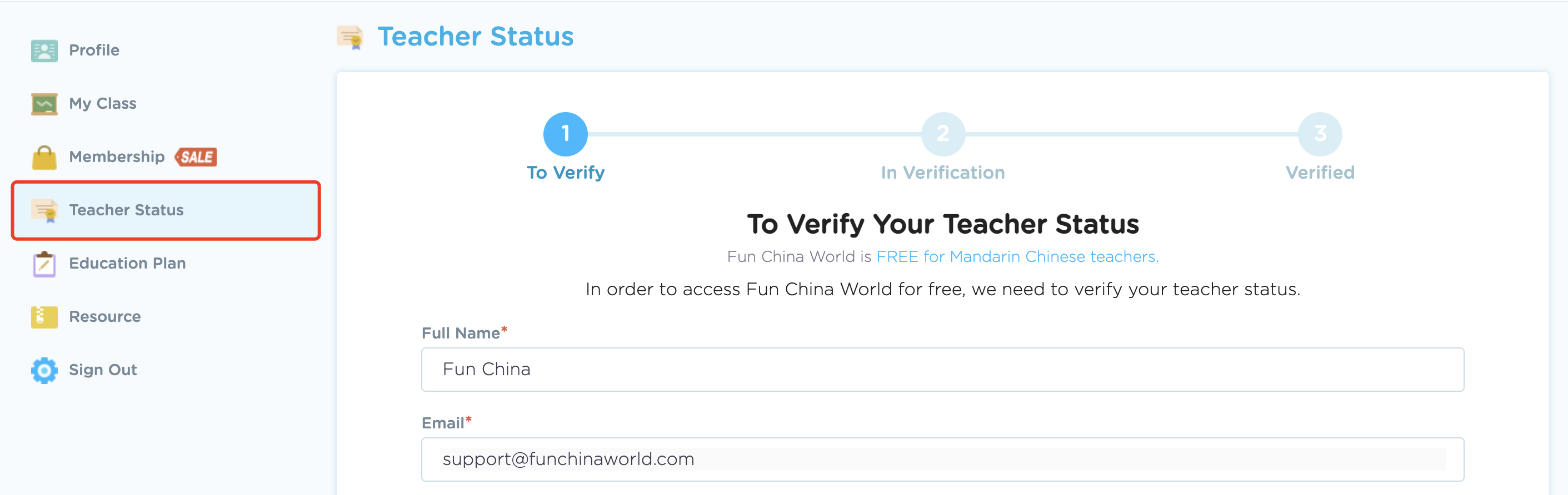 - If you successfully verified your "Teacher Status", you will be free to play/use FunChinaWorld with unlimited time.